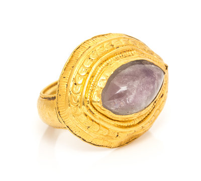 likely of modern manufacture in an ancient motif, containing one navette shape cabochon cut rock crystal bezel set with embossed accents.