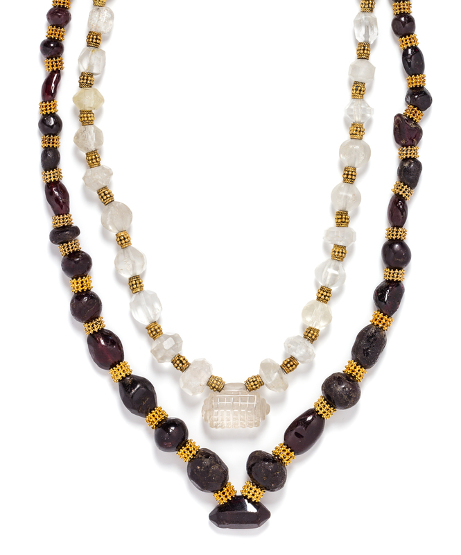 consisting of one necklace containing numerous faceted rock crystal beads measuring approximately 7.45-15.70 mm in diameter and one cross-hatched rock crystal pendant measuring approximately 28.00 x 13.82 mm interspersed with yellow gold rondelles with granular and wirework accents together with one necklace containing numerous tumbled garnet beads interspersed with yellow gold rondelles with granular accents.