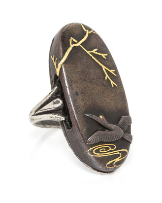 containing a central shakudo plaque depicting a raised crane in flight between a water and tree landscape motif all in gold, against a blackened background, within a silver ring setting.
