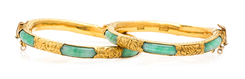 A Pair of High Karat Yellow Gold and Jade Bangle Bracelets,