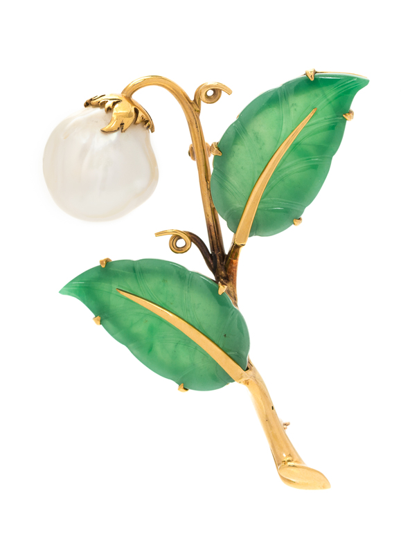 A Yellow Gold, Jade and Cultured Pearl Lily-of-the-Valley Brooch, Gump's,