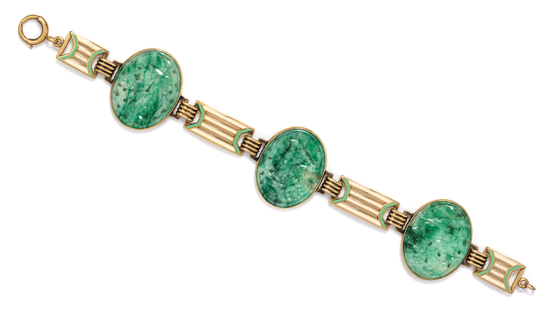 An Art Deco Yellow Gold, Jade and Polychrome Enamel Bracelet, Wordley Allsopp and Bliss,