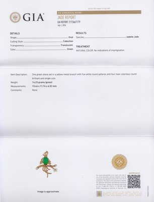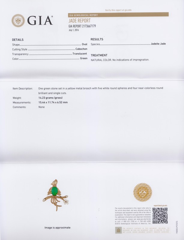 composed of a central oval cabochon cut translucent mottled green jade measuring approximately 15.44 x 11.74 x 6.52 mm, the jade set within a textured and high polish bird motif surround atop a brand motif base, the brooch containing four round brilliant and single cut diamonds weighing approximately 0.11 carat total, and five pearls measuring approximately 3.50 mm in diameter.Stamp: 14K.Accompanied by a Gemological Institute of America jade identification certificate number 2173667179, dated July 1, 2016, stating Species: Jadeite Jade, Color: Green, Transparency: Translucent, Treatment: Natural Color, no indications of impregnation.