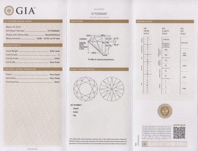 containing one round brilliant cut diamond weighing 5.02 carats and 178 round brilliant cut diamonds weighing approximately 1.94 carats total. Stamp: Michael B.Accompanied by a Gemological Institute of America diamond grading certificate number 5172550481, dated March 29, 2016, stating Color: L, Clarity: VVS2, Cut: Very Good, Polish: Very Good, Symmetry: Very Good, Fluorescence: None.