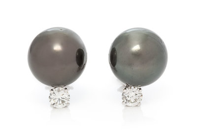 A Pair of 18 Karat White Gold, Cultured Tahitian Pearl and Diamond Earclips,
