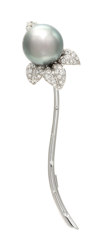 An 18 Karat White Gold, Cultured Tahitian Pearl and Diamond Flower Brooch, Sidney Garber,