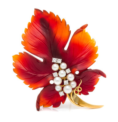 An 18 Karat Yellow Gold, Carved Carnelian, Cultured Pearl, and Diamond Leaf Brooch,
