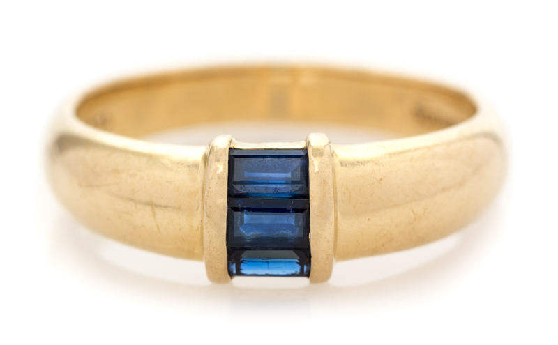 in a polished band centrally channel set with three rectangular step cut sapphires weighing approximately 0.30 carat total.Stamp: TIFFANY & CO. 750.