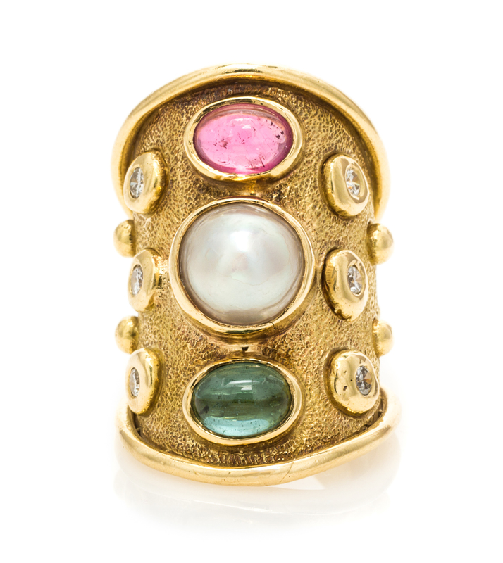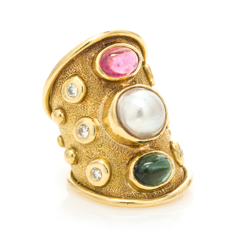 An 18 Karat Gold, Tourmaline, Diamond and Mabe Pearl Ring, Denise Roberge,