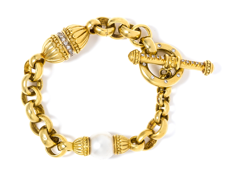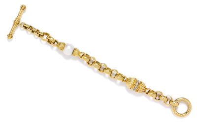 consisting of an oval link chain set with one pearl measuring approximately 12.75 mm in diameter and a fluted oval form yellow gold bead containing 19 round brilliant cut diamonds weighing approximately 0.29 carat total, the toggle clasp containing 18 round brilliant cut diamonds weighing approximately 0.32 carat total.