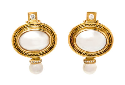 A Pair of 18 Karat Yellow Gold, Cultured Pearl, Mabe Pearl and Diamond Earclips, Elizabeth Gage,