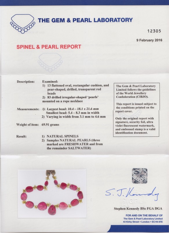 containing 13 spinel beads measuring from approximately 21.60 x 18.10 x 10.40 mm to 8.30 x 5.40 mm, alternating with clusters of 83 natural pearls strung on yellow gold wire, braided cord terminals with slide allow for adjustable length.Accompanied by a Gem & Pearl Laboratory spinel and pearl identification certificate number 12305, dated February 9, 2016, stating Result: Natural Spinels, Natural Pearls (three freshwater, the remainder Saltwater).