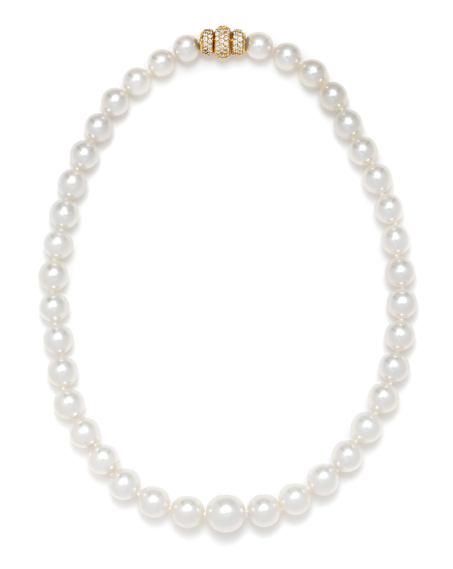 A Graduated Single Strand Cultured South Sea Pearl Necklace with Gold and Diamond Clasp,