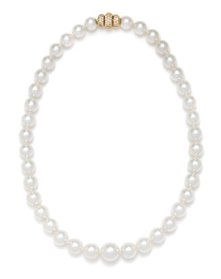 containing 39 pearls measuring approximately 10.24-14.46 mm in diameter strung knotted with a triple lobed yellow gold clasp pave set with 105 round brilliant cut diamonds weighing approximately 2.63 carats total.