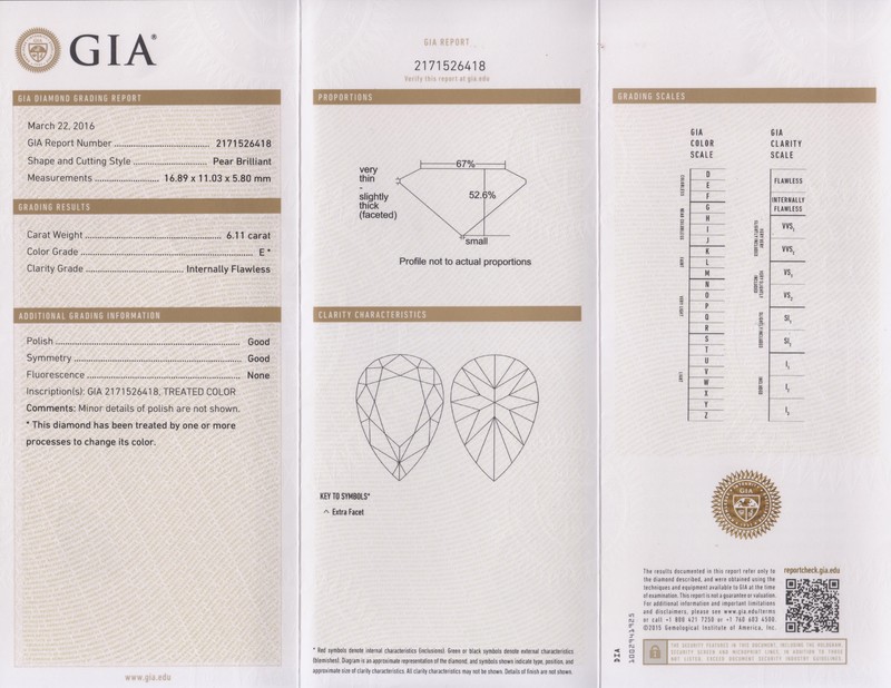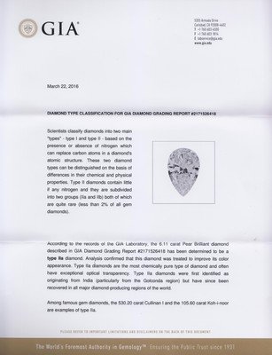 containing one pear shape diamond weighing approximately 6.11 carats.Accompanied by a Gemological Institute of America diamond grading certificate number 2171526418, dated March 22, 2016, stating Color: E, Clarity: Internally Flawless, Polish: Good, Symmetry: Good, Fluorescence: None, Comments: This diamond has been treated.Accompanied by a Gemological Institute of America diamond type classification letter, dated March 22, 2016, stating that this treated diamond has been found to be a Type IIa (or Golconda type) stone, the most chemically pure type of diamond which often have exceptional optical transparency.