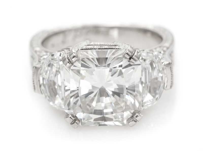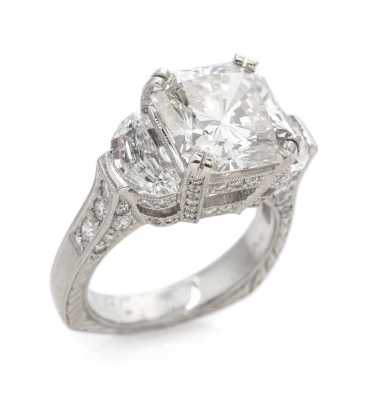containing a HPHT-treated radiant cut diamond weighing approximately 5.45 carats, two half moon cut diamonds weighing approximately 1.32 carats total, and numerous round brilliant cut diamonds weighing approximately 1.33 carats total. Stamp: PLAT.Laser inscribed: bd P084AN.Together with a copy of a Gemological Institute of America diamond grading certificate number 11189042, dated July 7, 2000, stating Color: J, Clarity: VS1, Polish: Very Good, Symmetry: Very Good, Fluorescence: None, Comments: "GE POL 21135" is present on the girdle. Pegasus Overseas Limited (POL) states that this diamond has been processed to improve its appearance by General Electric Company (GE)."bd PO84AN" is present on the girdle.