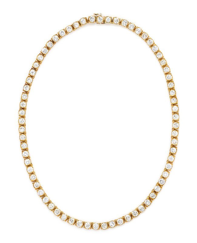 containing 69 half bezel set round brilliant cut diamonds weighing approximately 27.60 carats total.Stamp: 18Kt.