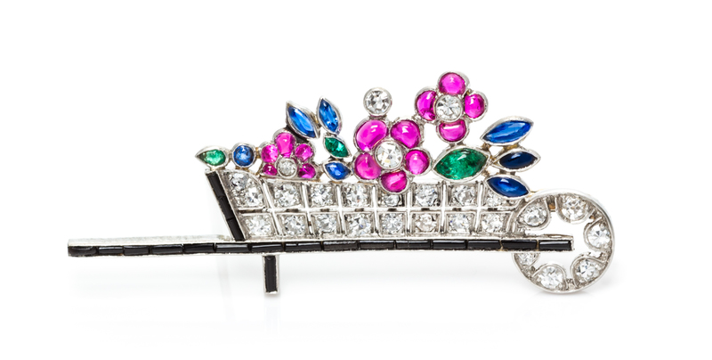 An Art Deco Platinum, Diamond, and Multigem Wheelbarrow Brooch, Austrian,