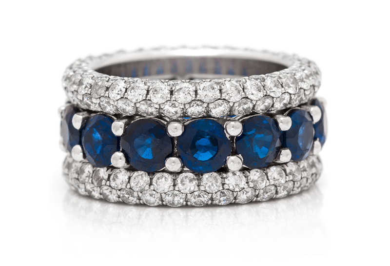 composed of three fused bands, containing 14 round brilliant cut sapphires weighing approximately 7.00 carats total, and 198 round brilliant cut diamonds weighing approximately 4.95 carats total.Stamp: 14K.