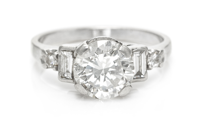 containing a round brilliant cut diamond weighing approximately 1.79 carats, two baguette cut diamonds weighing approximately 0.22 carat total and two round brilliant cut diamonds weighing approximately 0.08 carat total.