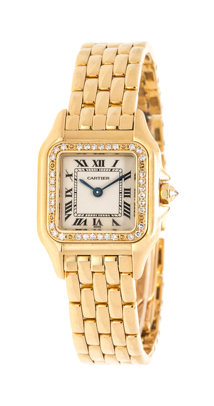 the bezel containing 36 round brilliant cut diamonds, 21.00 x 19.00 mm case dimensions, ivory color dial signed CARTIER with secret signature at 10 o'clock, Roman numerals, blued steel sword hands, polished case, case back affixed with eight screws, quartz movement, polished gold panther link bracelet, double deployant clasp.Stamp: Cartier WATER RESISTANCE SWISS MADE 18K 1280 2 M212436.Accompanied by a Cartier watch box and book.
