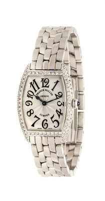 the bezel containing 96 pave set round brilliant cut diamonds weighing approximately 1.90 carats total, silvered guilloche finish dial signed FRANCK MULLER, Arabic numerals, blued steel spade hands, tonneau case, case back affixed with four screws, quartz movement signed FRANCK MULLER, polished link bracelet, double deployant clasp.