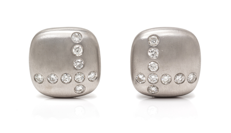 in a square design with matte finish, containing 18 round brilliant cut diamonds weighing approximately 1.80 carats total. Stamp: 750 (makers mark).
