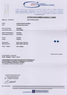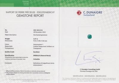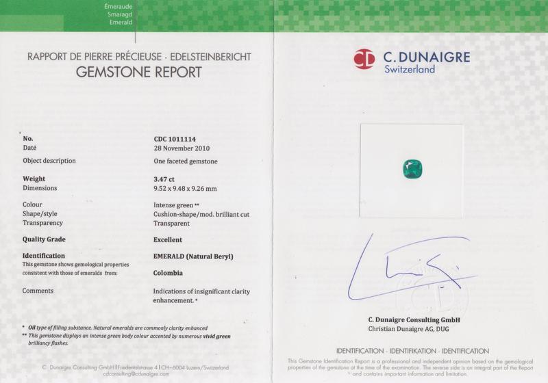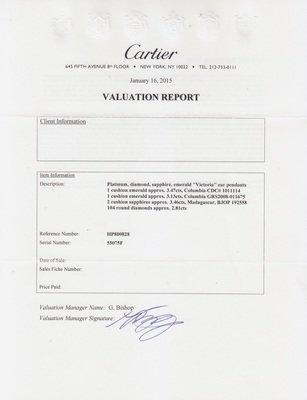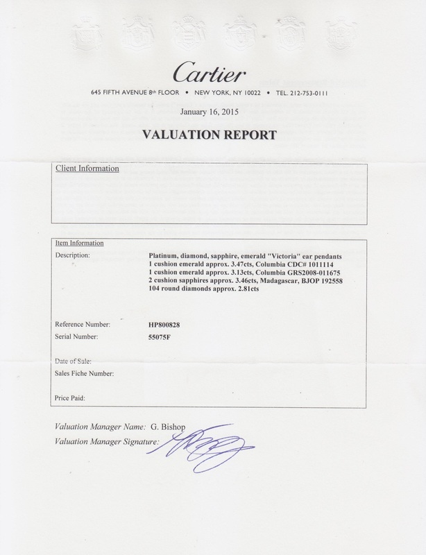 containing two cushion shape mixed cut emeralds weighing approximately 6.60 carats total, two cushion shape mixed cut sapphires weighing approximately 4.63 carats total, and 104 round brilliant cut diamonds weighing approximately 2.81 carats total.Engraved: 750 CARTIER PT950 55075F.Accompanied by a Gem Research Swisslabs emerald identification and origin certificate number 011675, dated January 8th, 2008, stating Weight: 3.13 carats, Identification: Natural Emerald, Origin: Colombia, Enhancement: None.Accompanied by a C. Dunaigre Switzerland emerald identification and origin certificate number CDC 1011114, dated November 28, 2010, stating Weight: 3.47 carats, Identification: Emerald (Natural Beryl), Origin: Colombia, Enhancement: Indications of insignificant clarity enhancement.Accompanied by a French Laboratory of Gemology sapphire identification and origin certificate number 192558, dated April 27, 2010, stating Species: Corundum, Variety: Sapphire, Enhancement: No indications of thermal enhancement.Accompanied by a copy of a Cartier Valuation Report dated June 18, 2012.