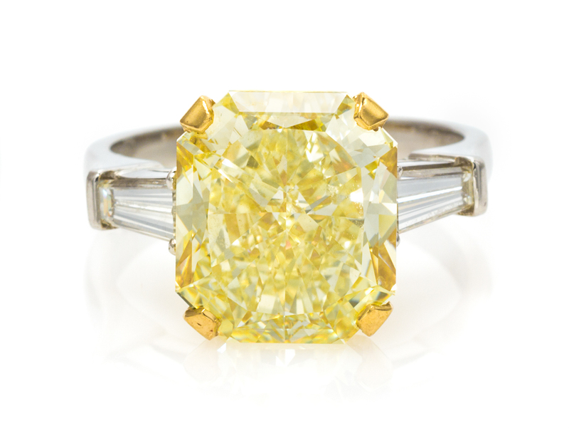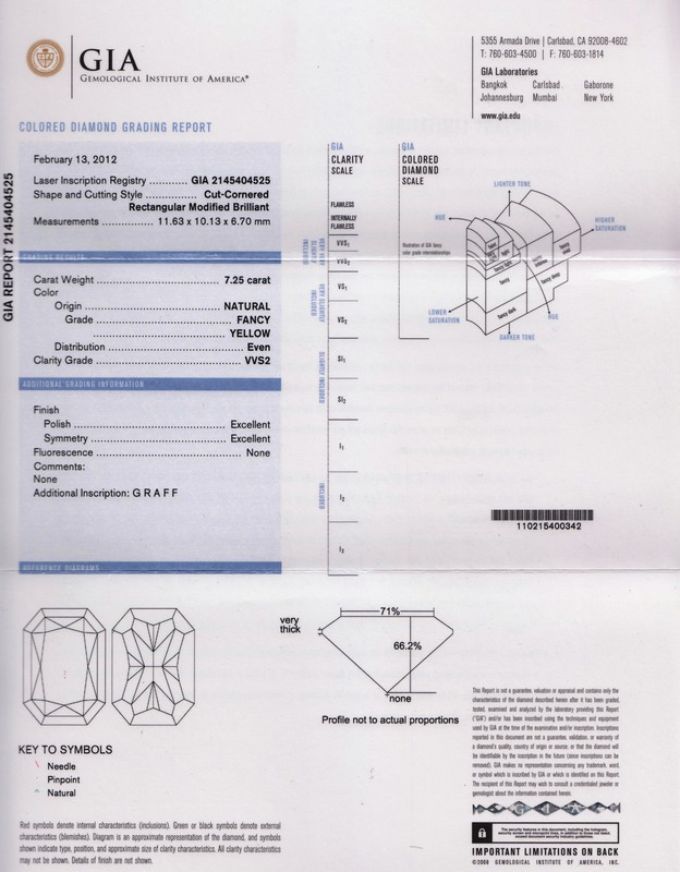 containing one radiant cut fancy yellow diamond weighing approximately 7.25 carats and two tapered baguette cut diamonds weighing approximately 0.48 carat total.Inscribed: GRAFF 7.25 FVVS2.Accompanied by an inner case and outer box signed GRAFF.Accompanied by a Gemological Institute of America colored diamond grading certificate number 2145404525, dated February 13, 2012, stating Color: Natural Fancy Yellow, Even, Clarity: VVS2, Polish: Very Excellent, Symmetry: Excellent, Fluorescence: None. Laser Inscription Registry: GIA 2145404525, Additional Inscription: GRAFF.