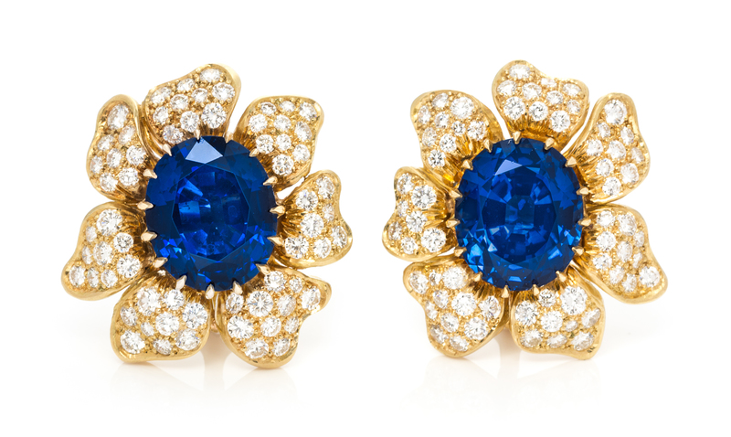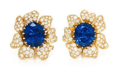 A Fine Pair of 18 Karat Yellow Gold, Unheated Sapphire and Diamond Earclips, Julius Cohen,