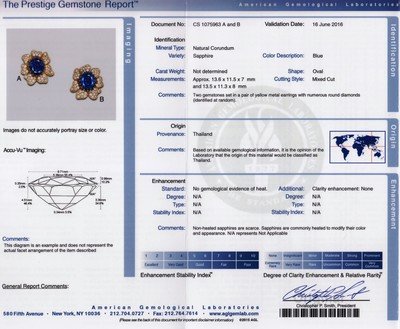 in a stylized flower motif, containing one oval sapphire weighing approximately 11.28 carats, one oval sapphire weighing approximately 9.97 carats, and 129 round brilliant cut diamonds weighing approximately 4.17 carats.Stamp: Julius Cohen 18K.Accompanied by an American Gemological Laboratories sapphire identification certificate number CS 1075963 A and B, dated June 16, 2016, stating Mineral Type: Natural Corundum, Variety: Sapphire, Origin: Thailand, Enhancement: None, Clarity Enhancement: None.