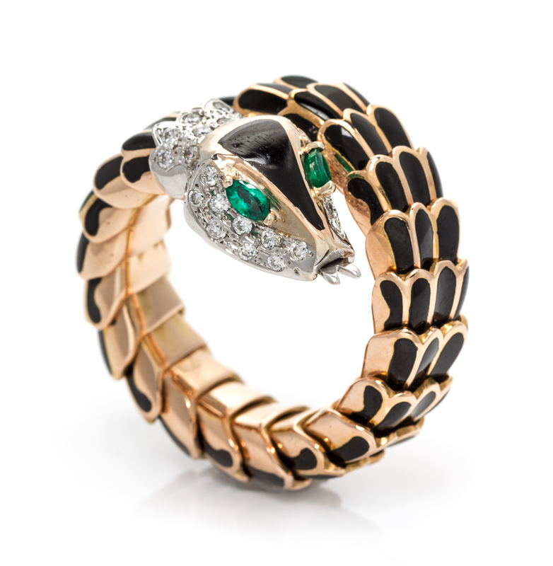 An 18 Karat Rose Gold, Diamond, Emerald and Enamel Serpent Ring,