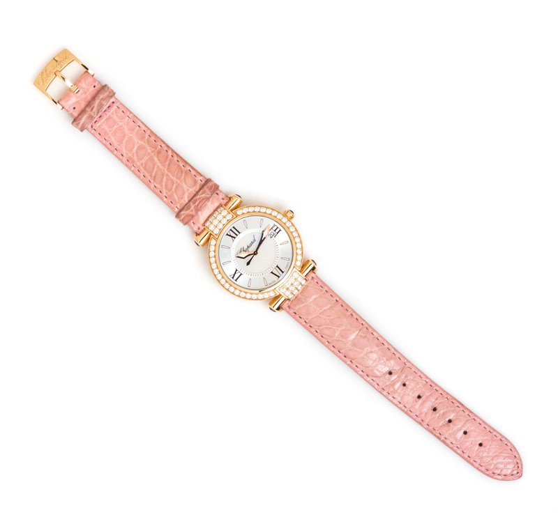 the bezel containing 58 round brilliant cut diamonds weighing approximately 2.27 carats total, the case measuring approximately 36.00 mm in diameter, two section dial with mother-of-pearl center signed Chopard with outer brushed silvered chapter ring, applied luminous rose gold index and Roman numerals, luminous rose gold lozenge hands with center sweep seconds hand, aperture at 3 o'clock for calendar date, amethyst at lugs, stem and crown, case back affixed with eight screws, quartz movement, pink alligator Tourneau strap, 18 karat rose gold tang buckle signed CHOPARD.Case back stamp: Chopard IMPERIALE 4221 Au750 1702645.