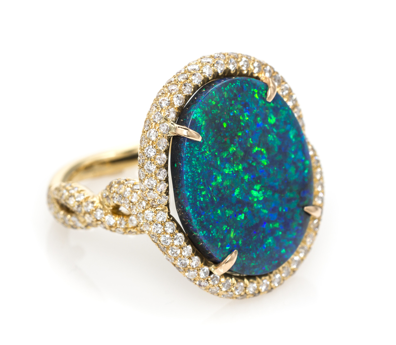 containing one oval cabochon cut black opal measuring approximately 19.05 x 15.63 x 5.57 mm and numerous round brilliant cut diamonds weighing approximately 2.78 carats total.