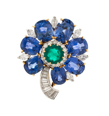 A Fine 18 Karat Yellow Gold, Platinum, Sapphire, Emerald and Diamond Flower Brooch,