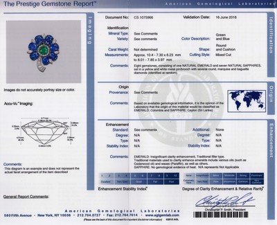 containing seven oval mixed cut sapphires weighing approximately 22.56 carats total, one round mixed cut emerald weighing approximately 1.55 carats, six marquise cut diamonds weighing approximately 0.83 carat total, eight tapered baguette cut diamonds weighing approximately 0.56 carat total, and 16 round single cut diamonds weighing approximately 0.35 carat total.Hand inscribed: (Scratchmark 28535).Accompanied by an American Gemological Laboratory emerald and sapphire identification and origin certificate number CS 1075966, dated June 16, 2016, stating Mineral Type: Natural Beryl, Variety: Emerald, Origin: Colombia, Clarity Enhancement: Insignificant, Type: Traditional, stating Mineral Type: Natural Corundum, Variety: Sapphire, Origin: Ceylon (Sri Lanka), Enhancement: None, Clarity Enhancement: None.