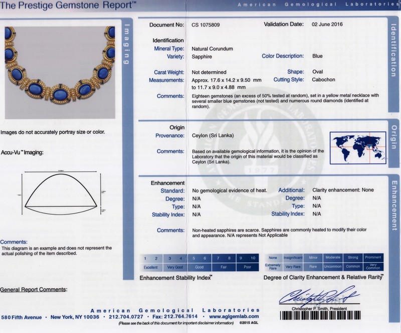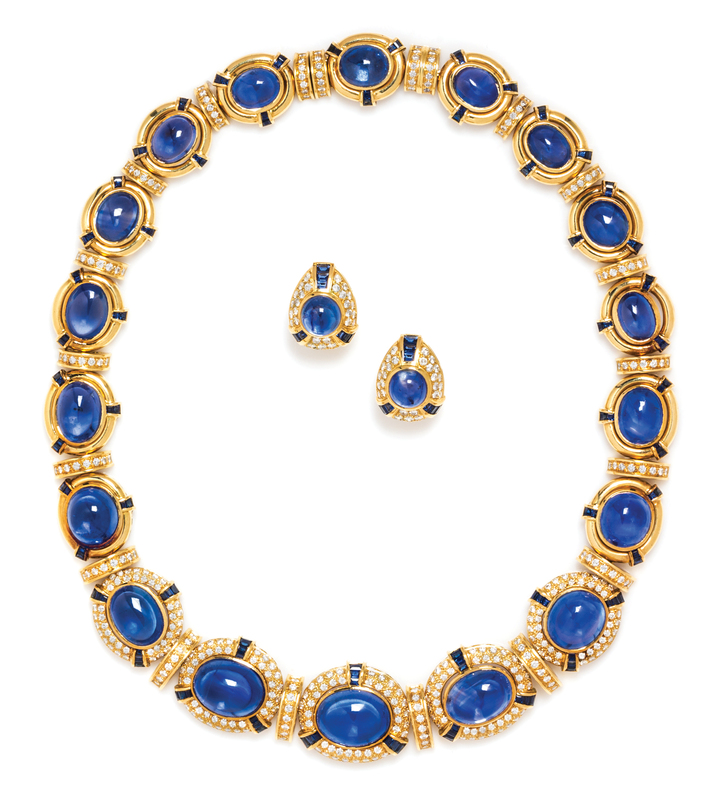 consisting of a collar necklace containing 18 oval cabochon cut sapphires ranging in size from approximately 17.60 x 14.20 x 9.50 mm to 11.70 x 9.00 x 4.88 mm, weighing approximately 255.00 carats total, 123 calibre tapered baguette cut sapphires weighing approximately 6.00 carats total, and numerous round brilliant cut diamonds weighing approximately 11.00 carats total, together with a pair of matching earclips containing two oval cabochon cut sapphires measuring approximately 9.96 x 9.68 x 7.46 mm and 9.86 x 9.05 x 7.80 mm respectively, weighing approximately 14.98 carats total, 18 tapered baguette cut sapphires weighing approximately 1.80 carats total, and numerous round brilliant cut diamonds weighing approximately 1.86 carats total, with collapsible posts.Necklace stamp: 750 (maker's mark W within circle) 87087.Earring stamp: 750 (maker's mark W within circle) (hand inscribed 87967).Accompanied by an American Gemological Laboratories sapphire identification and origin certificate number CS 1075809, dated June 2, 2016, stating the following for an excess of 50% of the sapphires tested in the necklace: Mineral Type: Natural Corundum, Variety: Sapphire, Origin: Ceylon (Sri Lanka), Enhancement: No indications of heat enhancement, Clarity Enhancement: None.