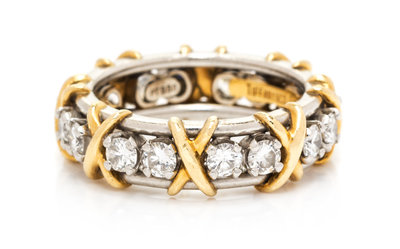 consisting of a platinum band with yellow gold crisscross accents, the ring containing 16 round brilliant cut diamonds weighing approximately 1.18 carats total.Stamp: PT950 TIFFANY&CO.SCHLUMBERGER 750.