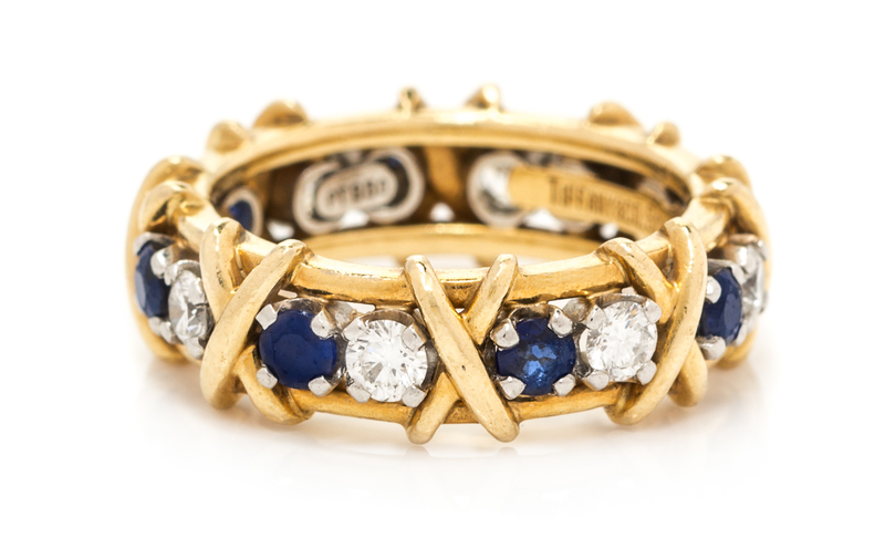 consisting of a yellow gold band with criss-cross accents, the ring containing eight round mixed cut sapphires weighing approximately 0.80 carat total and eight round brilliant cut diamonds weighing approximately 0.59 carat total.Stamp: Pt950 TIFFANY&CO.SCHLUMBERGER 750.
