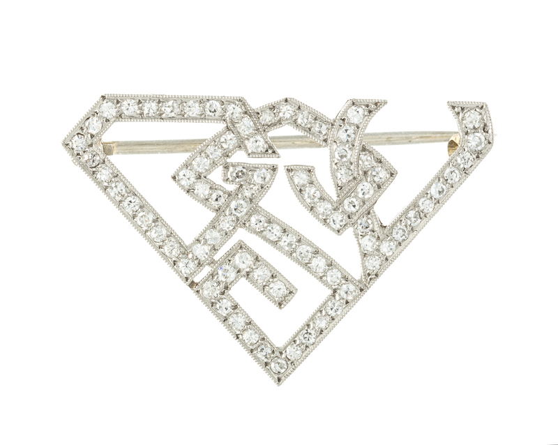 in an openwork geometric frame motif, depicting the letters GSV in an interlocking motif, the brooch containing 81 round single cut diamonds weighing approximately 0.60 carat total.