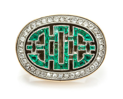 the center containing numerous rectangular and calibre step cut emeralds forming a geometric design, the border containing numerous rose cut diamonds.