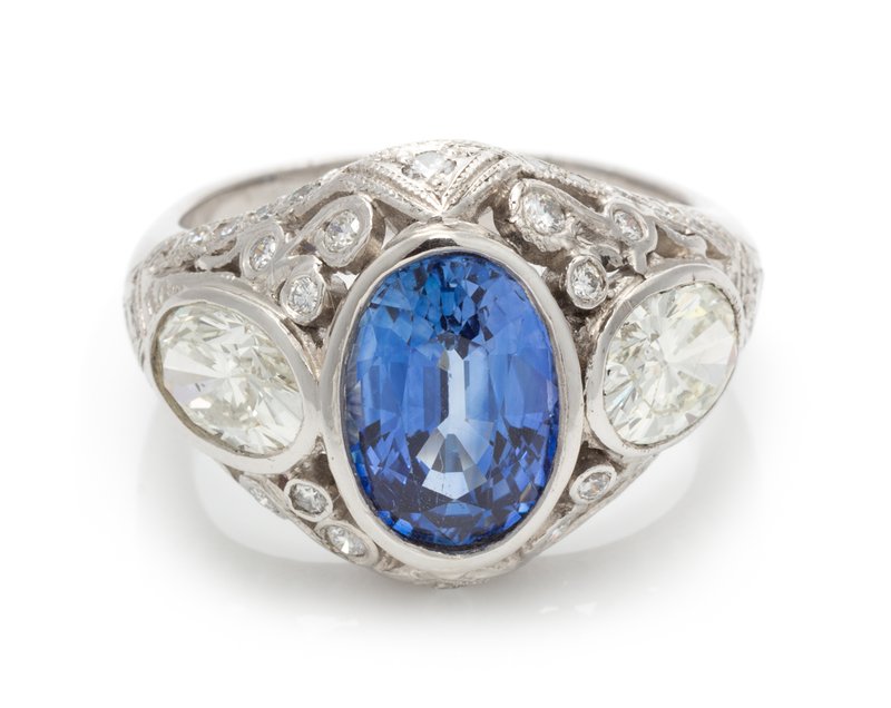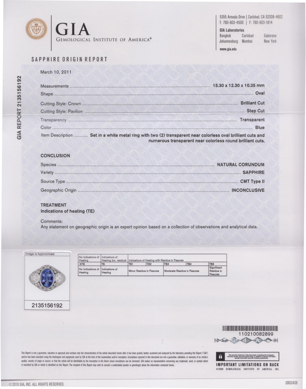containing one oval mixed cut sapphire measuring approximately 15.30 x 12.30 x 10.35 mm, two oval brilliant cut diamonds weighing approximately 1.66 carats total and 36 round brilliant cut diamonds weighing approximately 0.46 carat total.Stamp: PLAT.Accompanied by a Gemological Institute of America sapphire identification and origin certificate number 2135156192, dated March 10, 2011, stating Species: Natural Corundum, Variety: Natural Sapphire, Origin: Inconclusive, Treatment: Indications of heating.
