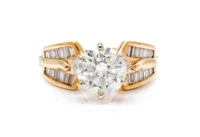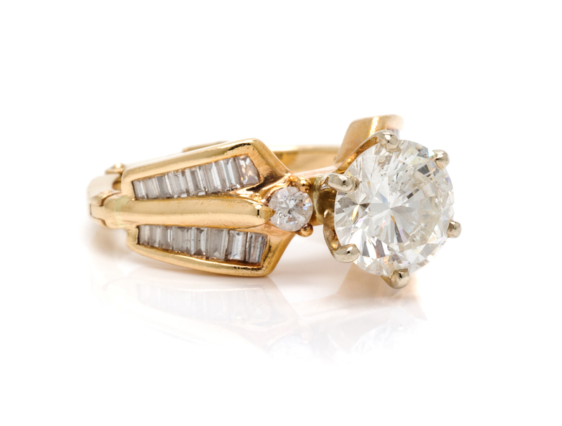 containing one round brilliant cut diamond weighing approximately 2.06 carats, two round brilliant cut diamonds weighing approximately 0.14 carat total, and 32 baguette cut diamonds weighing approximately 0.32 carat total.