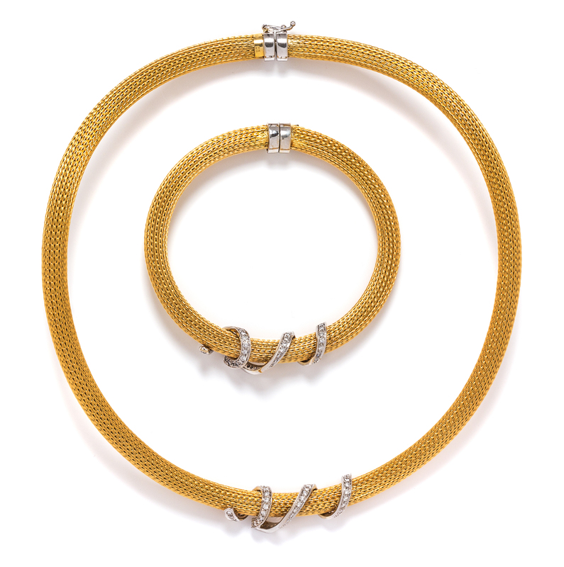 consisting of a yellow gold collar necklace in a woven gold design accented with a white gold spiral containing 48 round brilliant cut diamonds weighing approximately 0.72 carat total, together with a matching bracelet containing 48 round brilliant cut diamonds weighing approximately 0.72 carat totalStamp: CB 750.