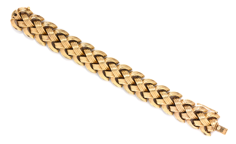 composed of a central raised line of fluted V-shape links with curved fluted outer rows, the bracelet measuring approximately 18.00 mm wide.Stamp: 14K.