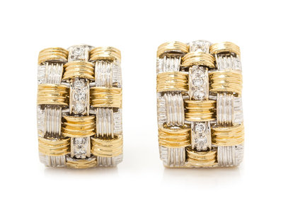 attributed to Roberto Coin, consisting of a yellow and white gold woven design, containing 18 round brilliant cut diamonds weighing approximately 0.36 carat total.Stamp: ITALY 18Kt IST. BREV (Italian registry for Roberto Coin).