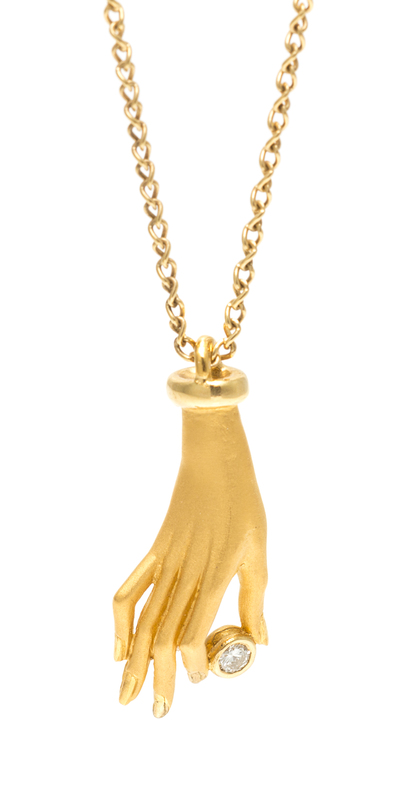 consisting of a realistic sculpted hand containing one round brilliant cut diamond weighing approximately 0.015 carat, suspended from an 18 karat yellow gold chain. Chain stamp: Carrera y Carrera 750 208383.Accompanied by a box and hangtag signed Carrera y Carrera.