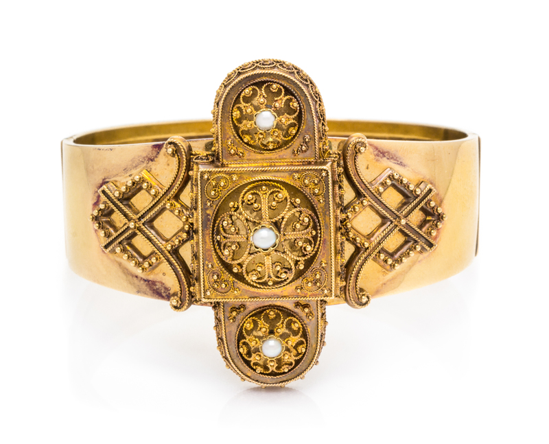 An Etruscan Revival 18 Karat Yellow Gold and Split Pearl Bangle Bracelet, Gustav Dahlgren & Co, Circa 1875,