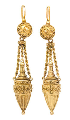 A Pair of Etruscan Revival Yellow Gold Pendant Earrings, French,