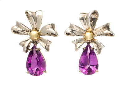 consisting of silver bows with gold center accents suspending two pear shape mixed cut amethysts measuring approximately 14.27 x 9.06 mm.Stamp: TIFFANY&Co. 925 750 1990.